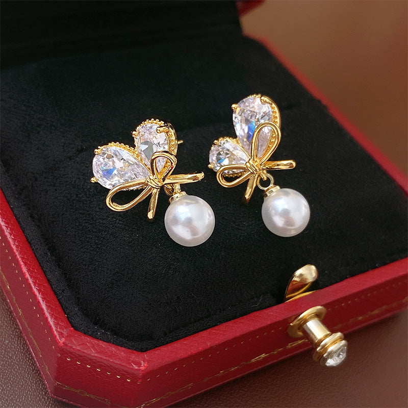 Elevate your style with these exquisite 18K gold-plated earrings, designed to embody timeless elegance and charm. Featuring dazzling heart-shaped crystal accents that form a delicate bow motif, each piece is adorned with a lustrous faux pearl drop, creating a look of sophistication and grace. The intricate craftsmanship and high-quality materials ensure these earrings shine brilliantly for any occasion, from casual outings to formal events. Perfect for gifting or adding a touch of luxury to your jewelry collection.