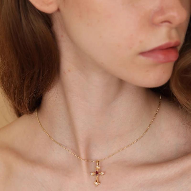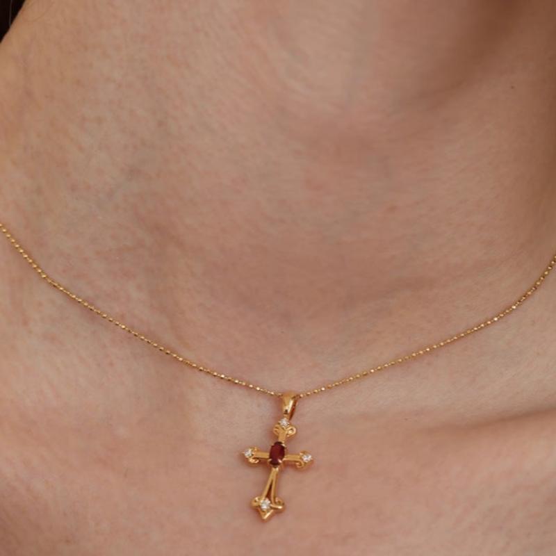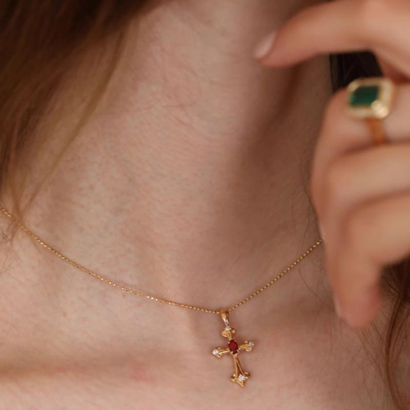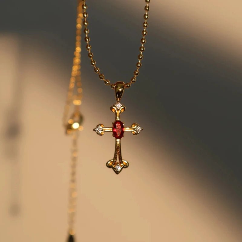 Elevate your style with this exquisite 18k gold-plated cross pendant necklace, a timeless piece blending elegance and sophistication. At its heart lies a vibrant red zircon, symbolizing passion and strength, while intricate detailing on the cross exudes vintage charm. The delicately crafted chain enhances the pendant's beauty, making it perfect for both everyday wear and special occasions. Ideal for layering or as a standalone statement, this necklace embodies the RosyCozy ethos of effortless style and empowerment. A stunning addition to any jewelry collection, this piece reflects the allure of Italian craftsmanship and the romance of French-inspired design.