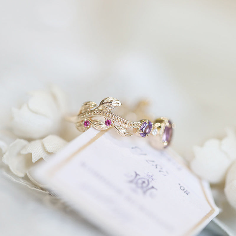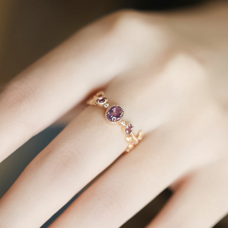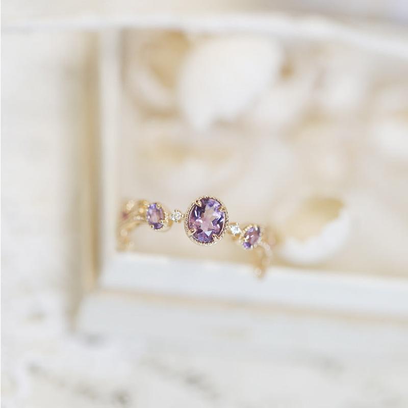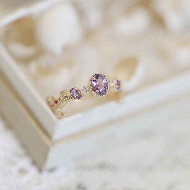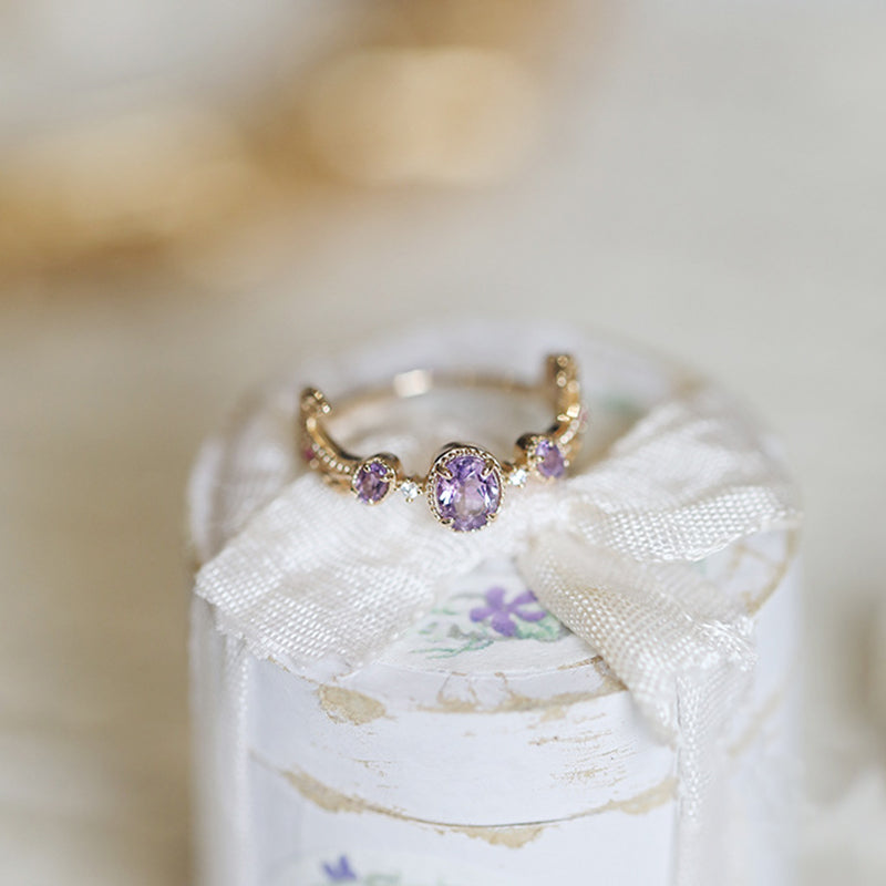 Inspired by the enchanting landscapes of Provence, this delicate ring showcases a stunning amethyst gemstone set in a romantic, vintage-inspired design. The 18k gold-plated setting adds a touch of luxury and durability, making it a perfect accessory for any occasion.