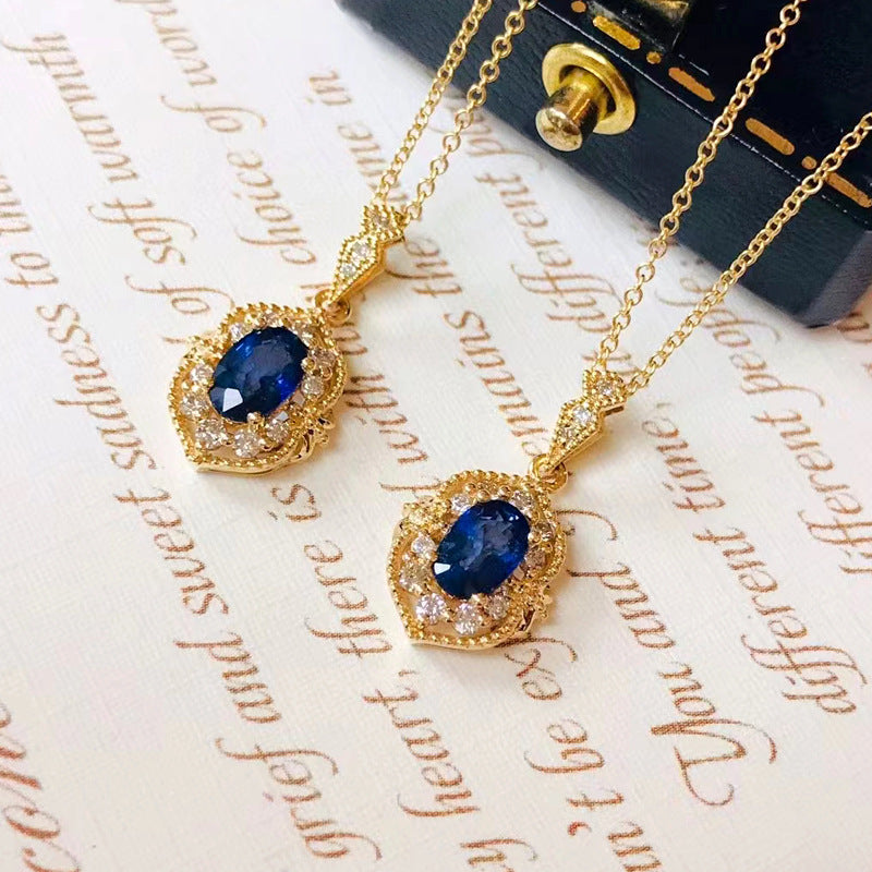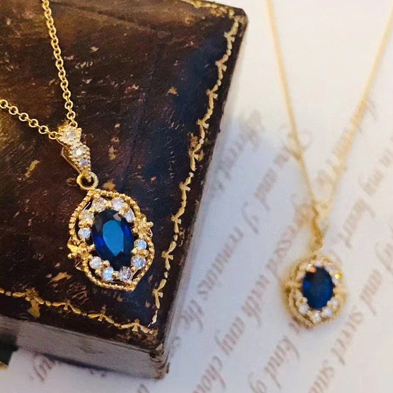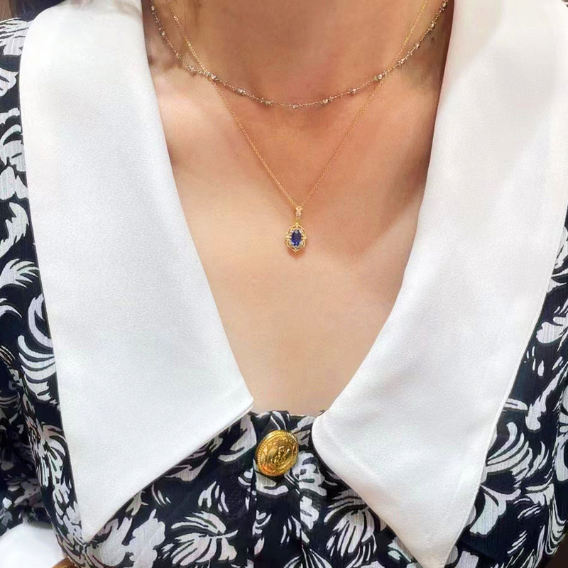 This elegant necklace features a stunning blue gemstone as its centerpiece, surrounded by shimmering tiny white zircons. The gold-plated base adds a touch of luxury, making it a captivating accessory.