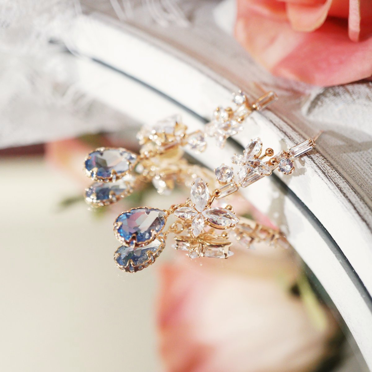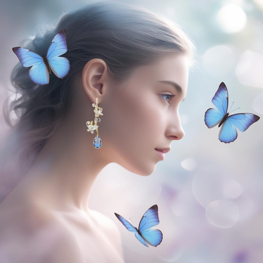 These exquisite gold-plated earrings feature an elegant arrangement of sparkling zircons, capturing a sophisticated and timeless look. Each earring is adorned with delicately crafted floral and butterfly-inspired details, adding a touch of whimsy and charm. At the bottom, a stunning blue teardrop stone dangles gracefully, framed in intricate gold accents that enhance its captivating glow. Perfect for any occasion, these earrings blend luxury and elegance, making them a beautiful addition to any jewelry collection.