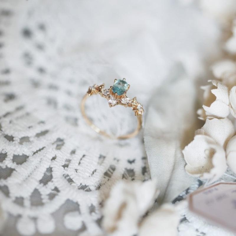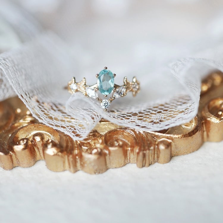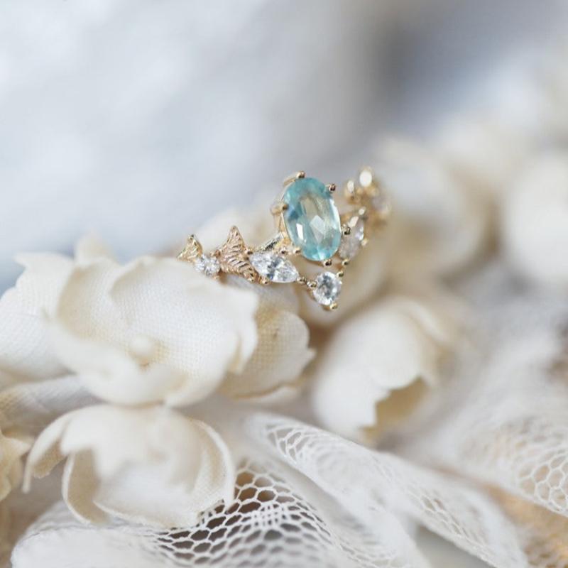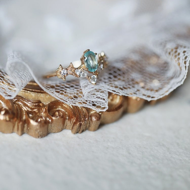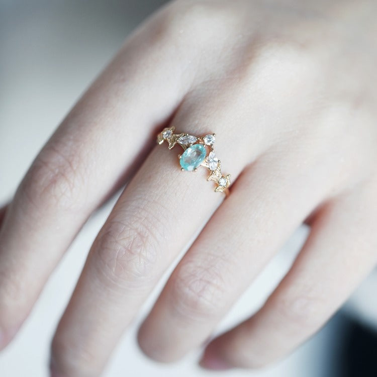 Discover the cosmic beauty of this Celestial Apatite and Diamond Ring. The oval-cut apatite, a gemstone known for its vibrant green color and connection to the third eye chakra, is beautifully surrounded by a constellation of shimmering diamonds. The intricate design, reminiscent of a starry night sky, adds a touch of magic and wonder to this piece.