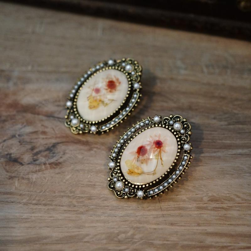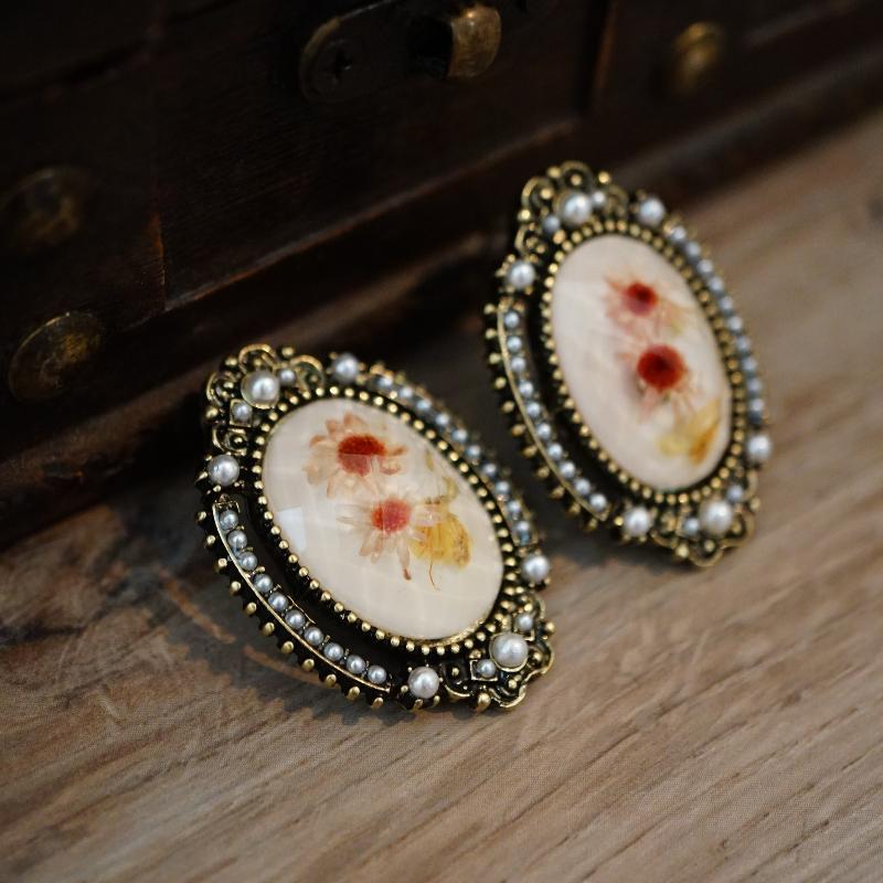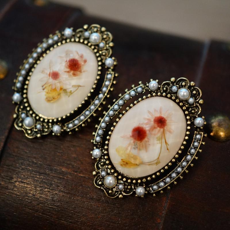 Step back in time with these stunning Vintage-Inspired Floral Earrings. The oval-shaped earrings feature a delicate floral design pressed within a transparent resin, capturing the natural beauty of dried flowers. The surrounding pearls and intricate gold-toned frame add a touch of elegance and sophistication. These earrings are perfect for adding a unique and vintage-inspired touch to any outfit.