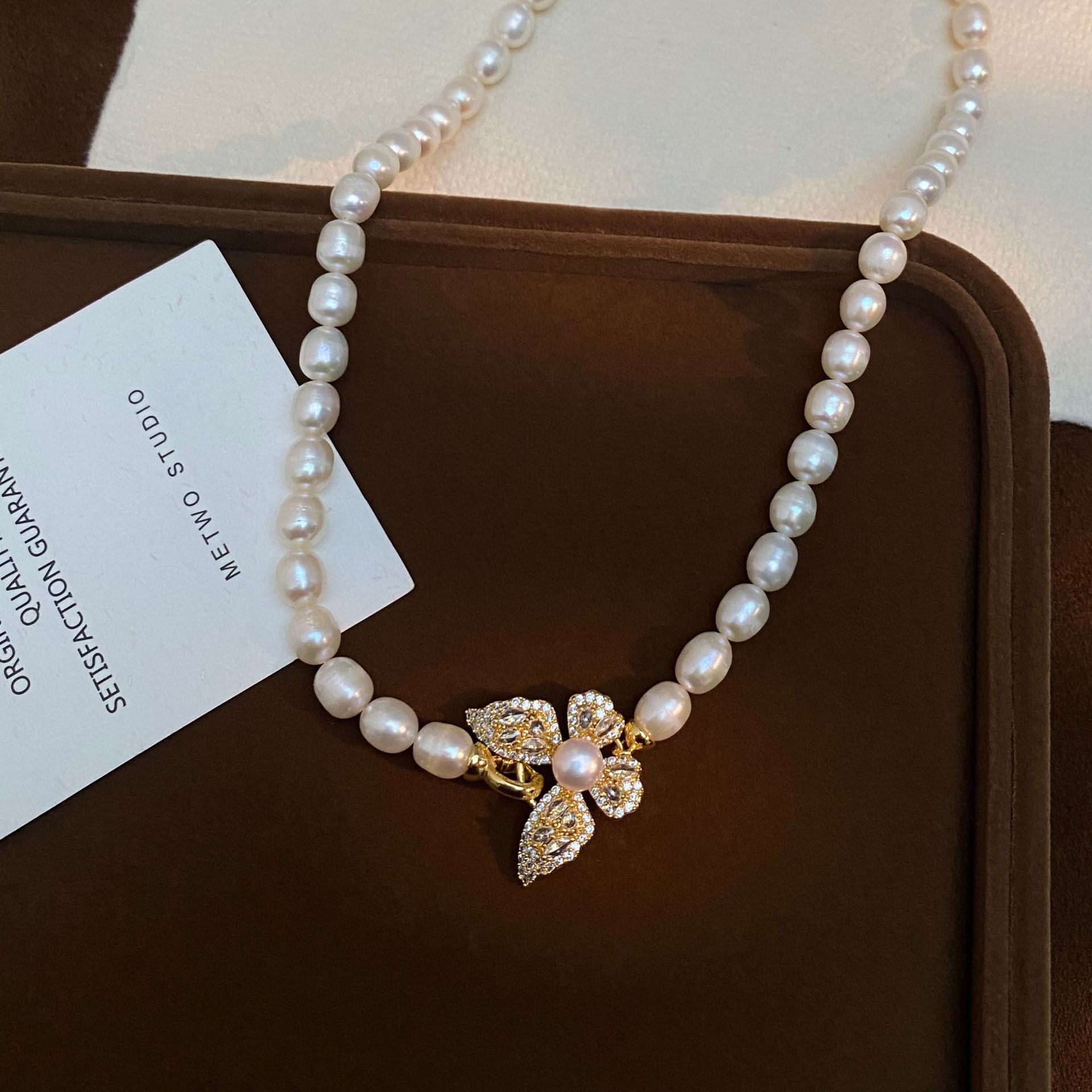 Embrace timeless elegance with this stunning freshwater pearl necklace, featuring lustrous 5-6mm oval-shaped pearls that exude sophistication. The centerpiece of this design is a delicate butterfly charm, crafted with 18K gold plating and adorned with shimmering cubic zirconia accents, symbolizing grace and transformation. This exquisite piece is perfect for elevating any outfit, from casual ensembles to formal attire, making it an essential addition to your jewelry collection. Wear it as a statement of femininity and elegance or gift it to someone special.