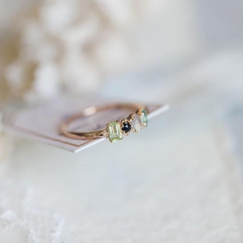 Step into Monet’s dreamy world with this Enchanted Garden Multi-Gem Ring, a delicate piece inspired by the soft colors and poetic serenity of Water Lily Pond. Each gemstone—rich green, deep black, shimmering clear, and tranquil blue—is thoughtfully arranged like blossoms scattered across an artist’s canvas.