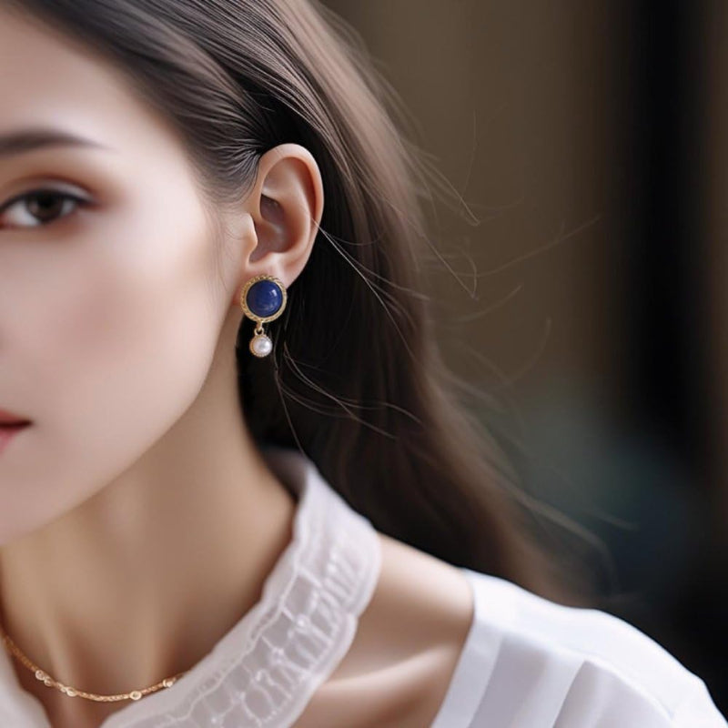 These earrings are exquisite, showcasing a stunning blue color that's elegantly accented by a lustrous pearl. The golden plated setting adds a touch of luxury and vintage charm, making them a perfect accessory for any occasion.