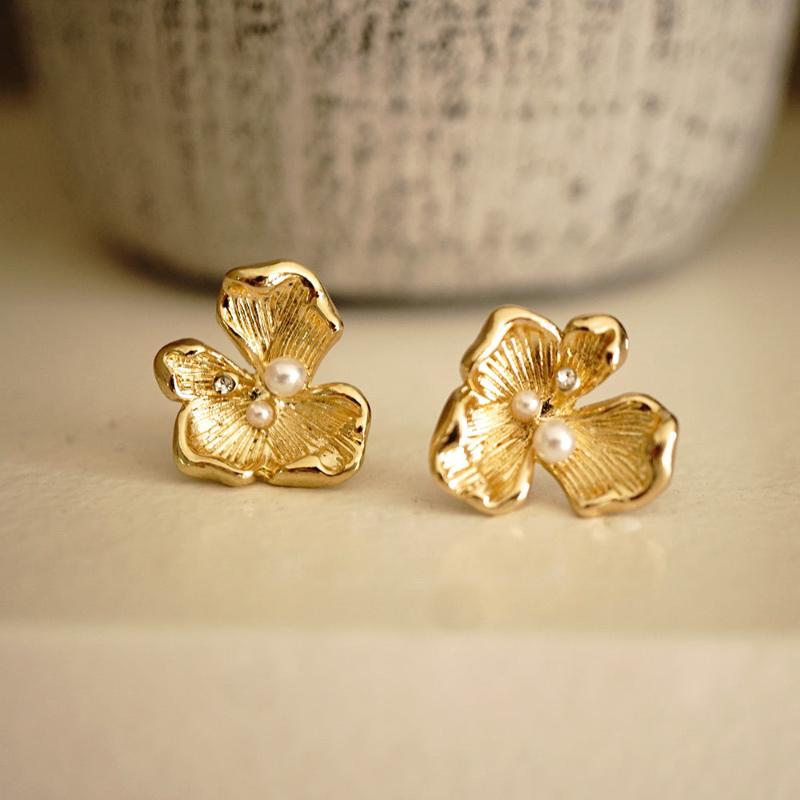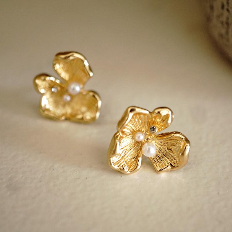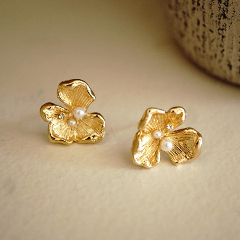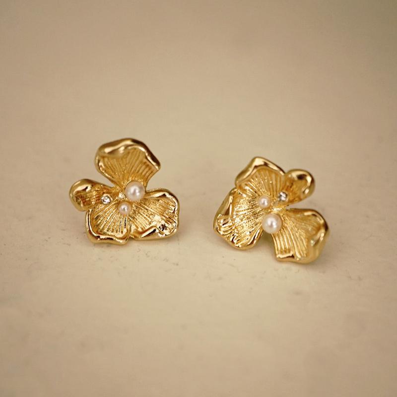 These cute plated gold flower stud earrings feature a delicate floral design adorned with two tiny pearls and a rhinestone that mimic the look of stamens. The gold plating adds a warm, radiant touch, while the pearls and rhinestone catch the light with every movement. Perfect for adding a subtle touch of elegance to any outfit.