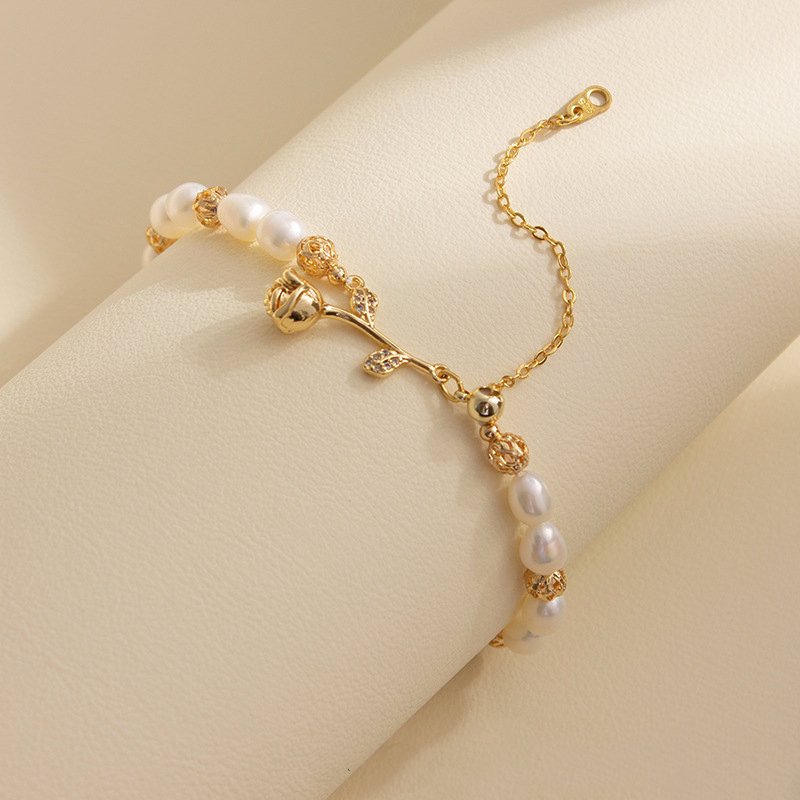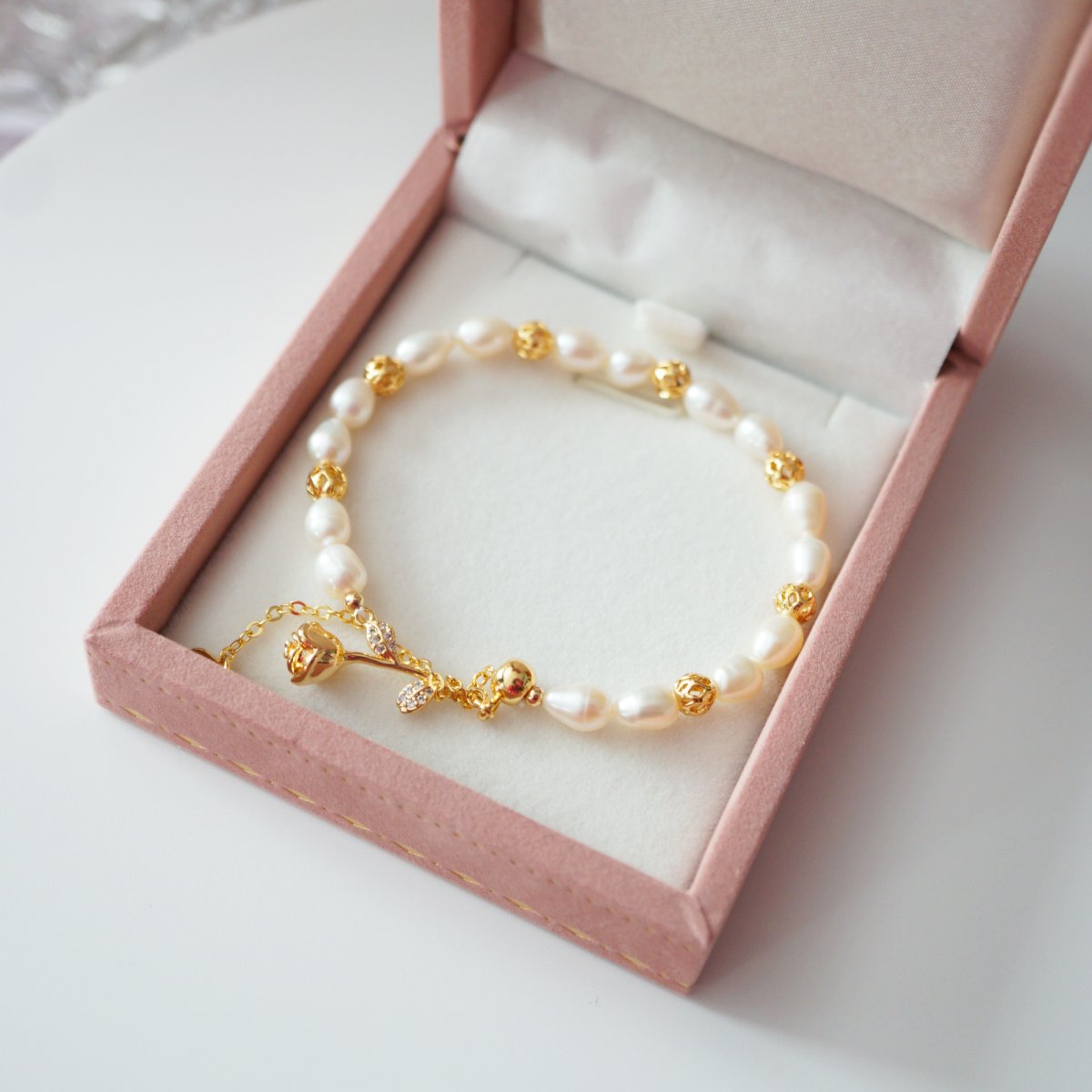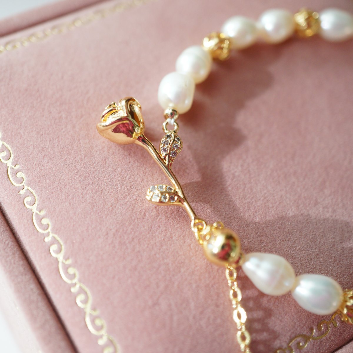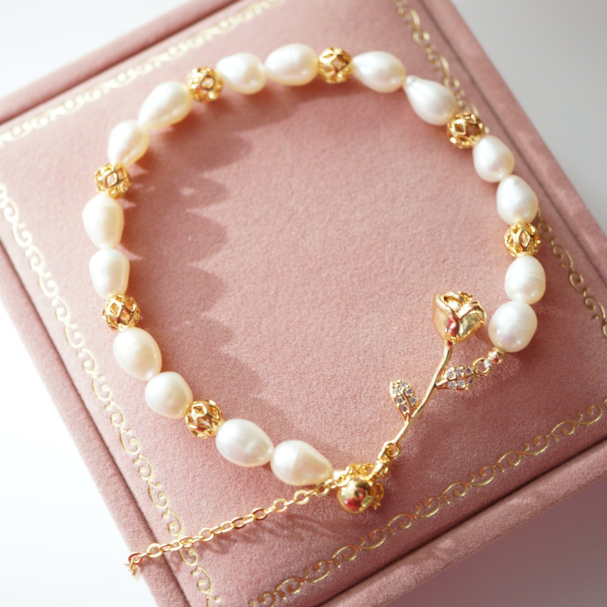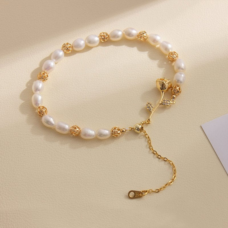 Indulge in timeless elegance with our exquisite Rose Gold Freshwater Pearl Bracelet. Crafted with the finest materials, this stunning piece features a delicate chain adorned with lustrous freshwater pearls and a captivating rose charm. The adjustable chain ensures a perfect fit for any wrist, making it a versatile accessory for both casual and formal occasions.