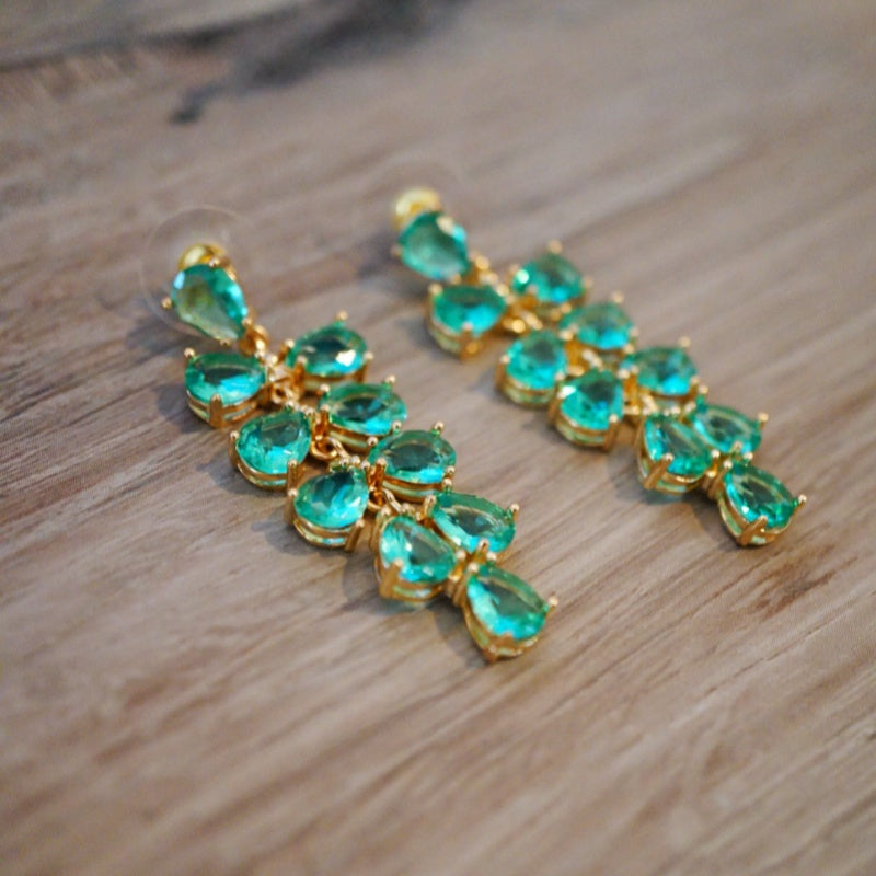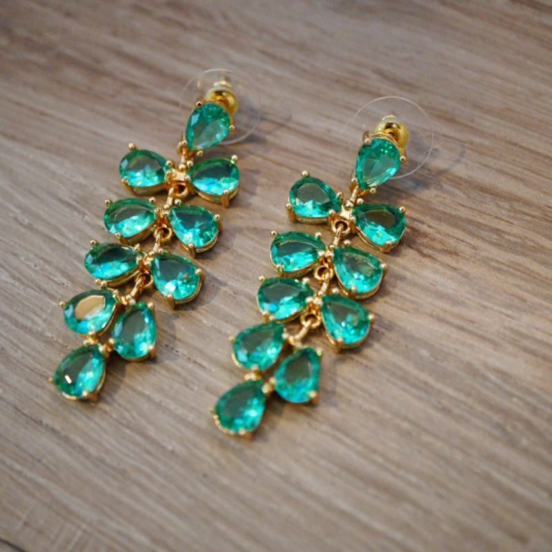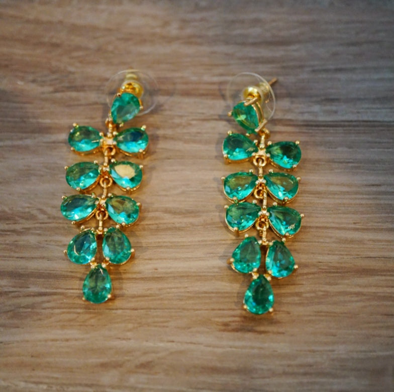 The delicate gold-toned setting showcases a cascade of shimmering green gemstones that resemble lush leaves. These earrings are perfect for adding a touch of elegance and sophistication to any ensemble. Whether you're attending a special occasion or simply want to elevate your everyday style, these green leaf earrings are sure to make a statement.