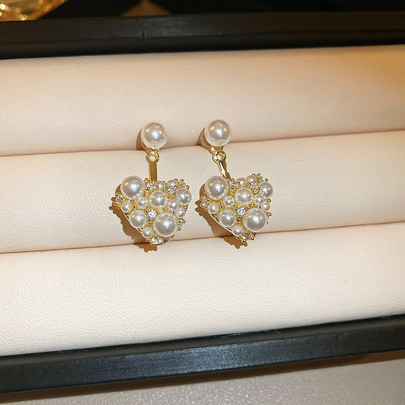 These enchanting earrings capture the essence of romance with a playful twist. Crafted into a heart shape, they feature a captivating arrangement of pearls in various sizes, creating a mesmerizing and unique design.