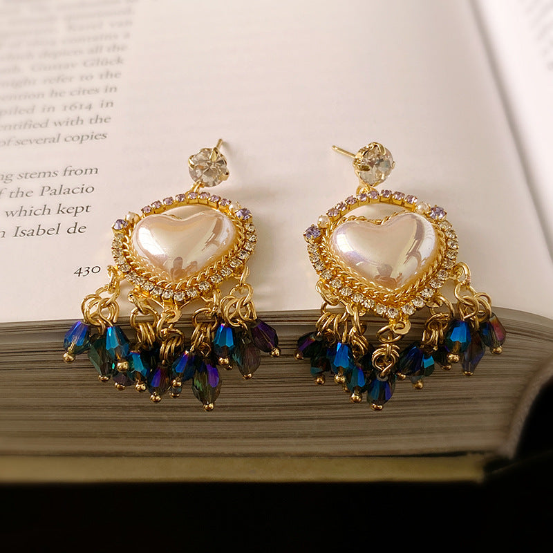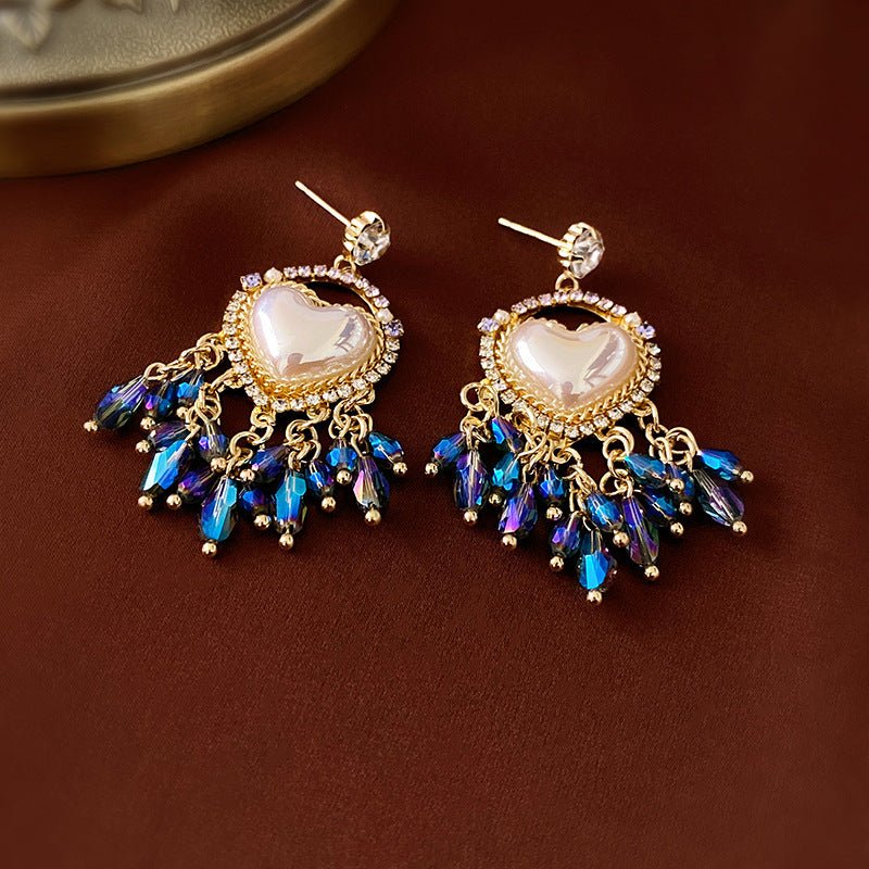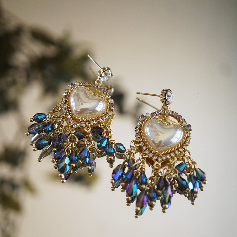These earrings feature a captivating heart-shaped design with a touch of vintage elegance. Each earring showcases a large, lustrous pearl set in a shimmering gold-tone metal frame, embellished with sparkling rhinestones. Below the heart, a cascade of blue crystal beads hangs delicately, reminiscent of a shimmering waterfall. The earrings have a romantic and whimsical feel, making them a perfect statement piece for any occasion.