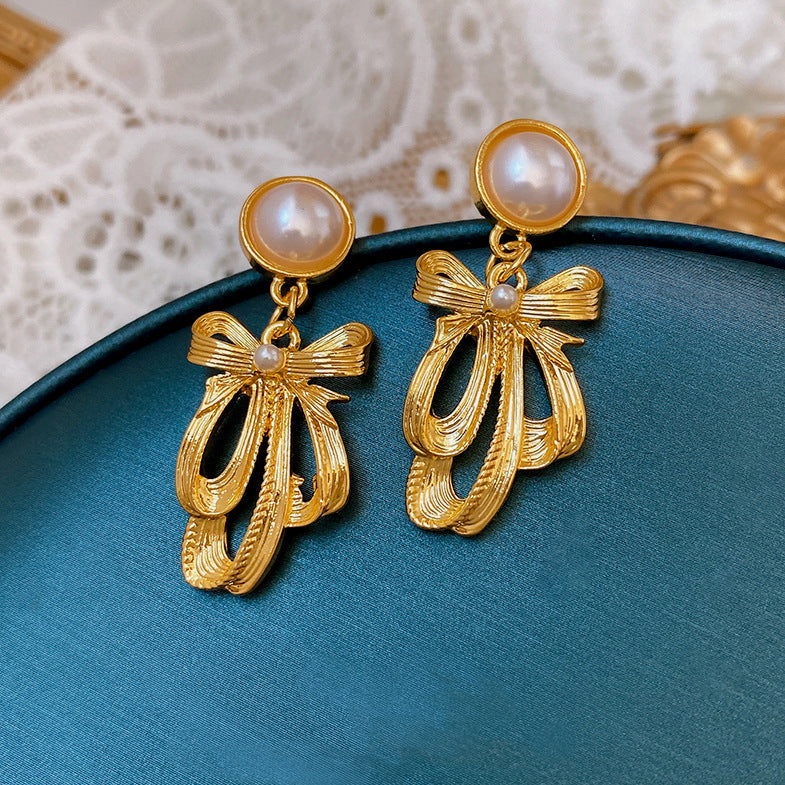 These earrings are a playful nod to vintage charm. Gold-plated metal forms intricate bowknot shapes, dangling delicately from the ear. Each bow is crowned with a luminous faux pearl, a classic touch that adds a touch of opulence. Perfect for adding a dash of retro flair to your modern look.