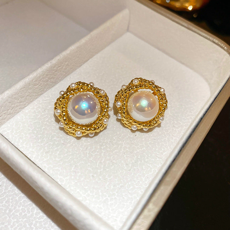 The earrings feature a classic and elegant design with a modern twist. Each earring boasts a large, lustrous pearl set in a shimmering gold-tone metal. The pearl is surrounded by a delicate rope-like pattern adorned with tiny pearls, adding a touch of vintage charm. The overall design is both sophisticated and eye-catching, making these earrings a versatile accessory that can be dressed up or down.