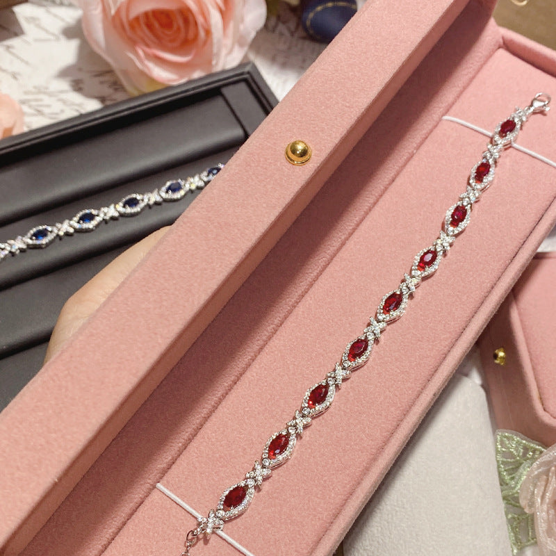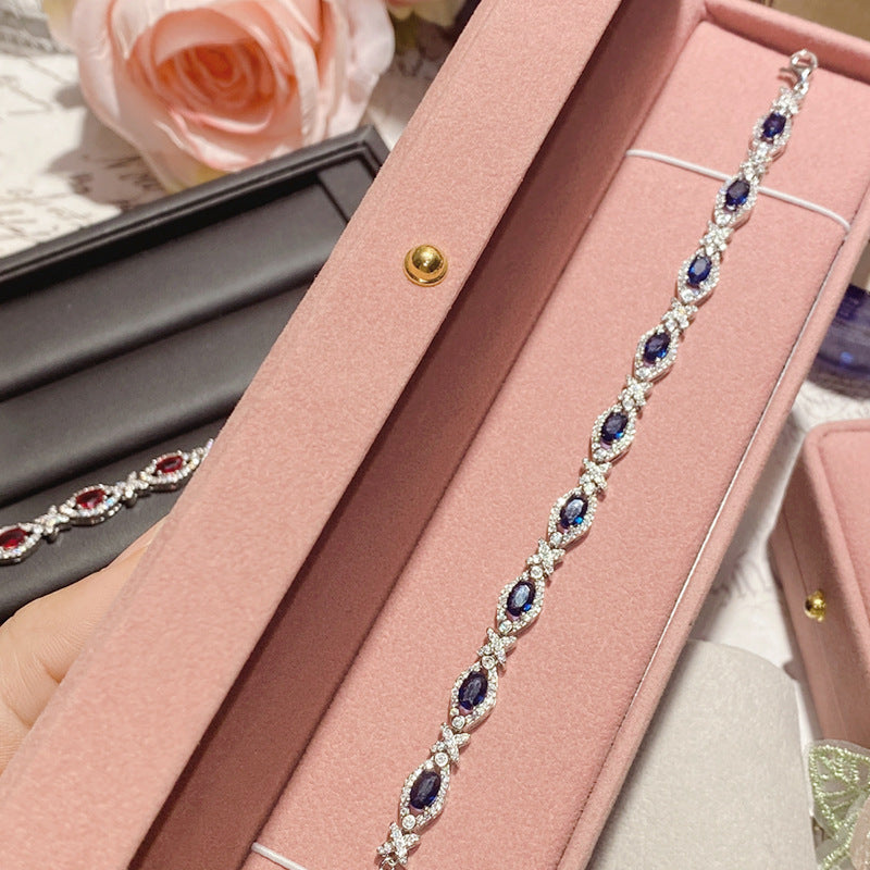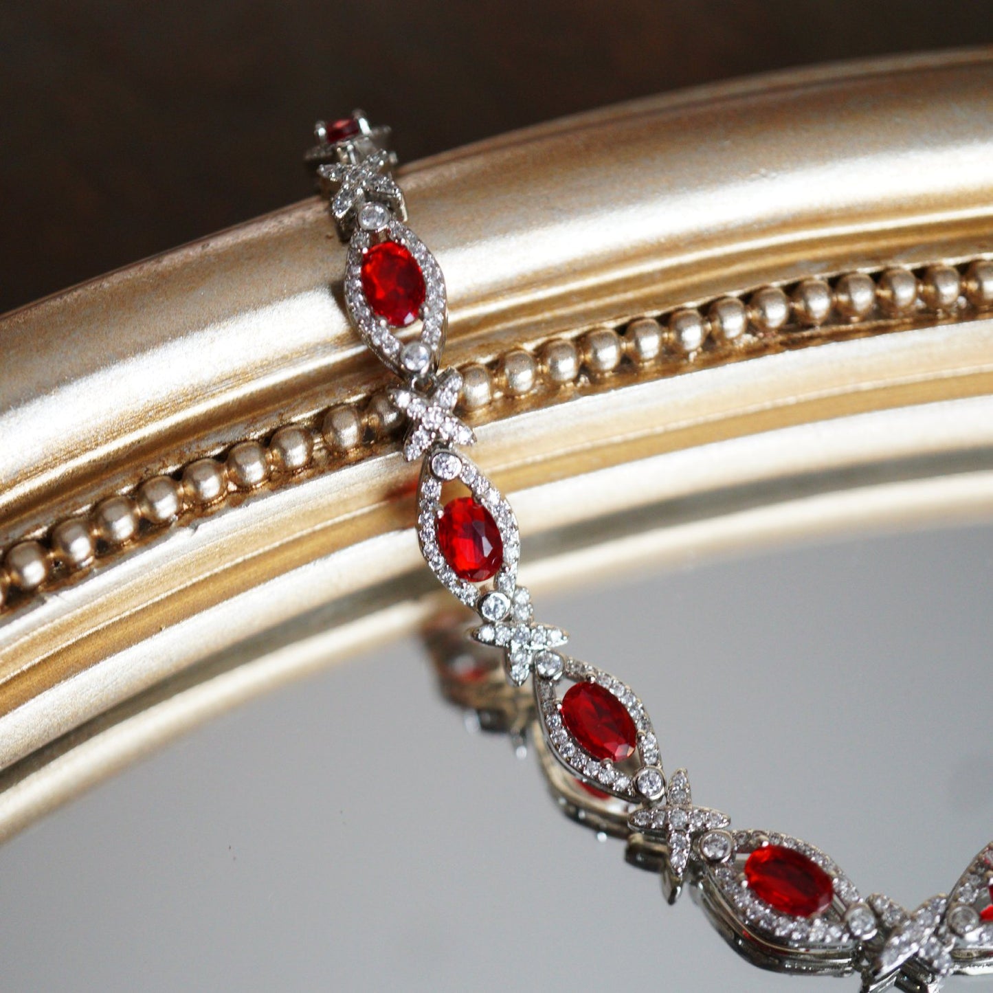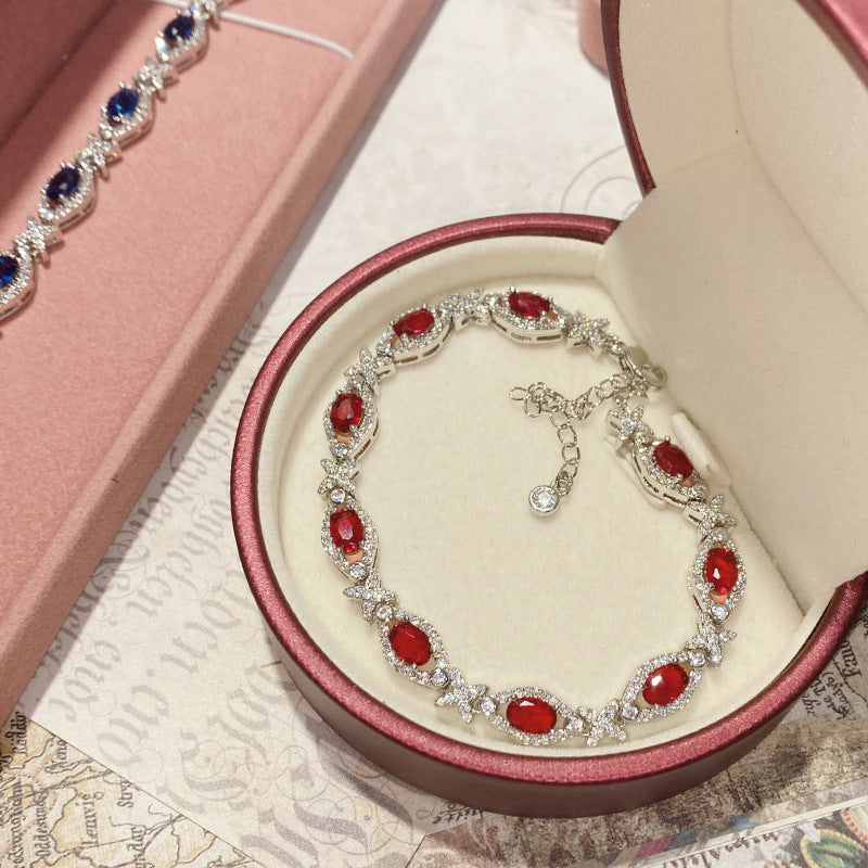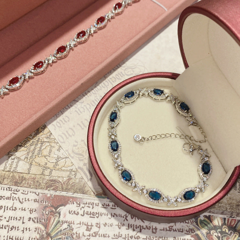 Add a touch of regal elegance to your jewelry collection with our 18K White Gold Plated Zircon Bracelet, available in two captivating colors: royal red and sapphire blue. Each bracelet features dazzling oval-cut zircon gemstones surrounded by intricately set clear zircon accents, creating a timeless and luxurious design inspired by vintage Italian and French styles.