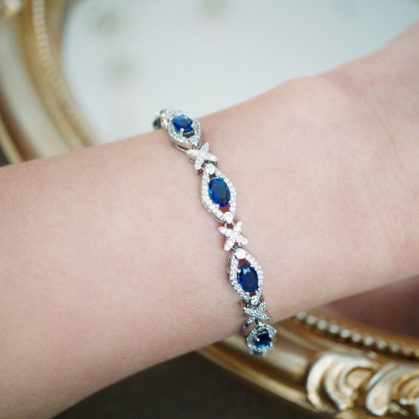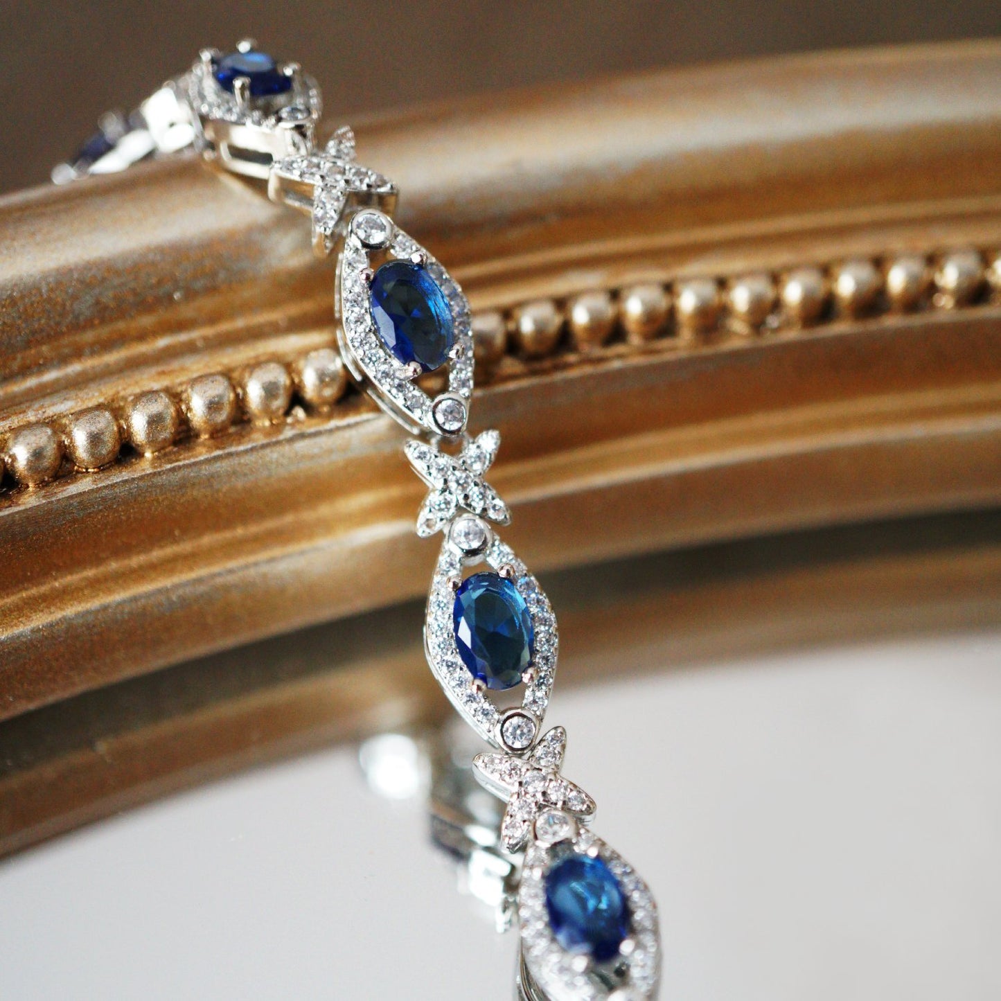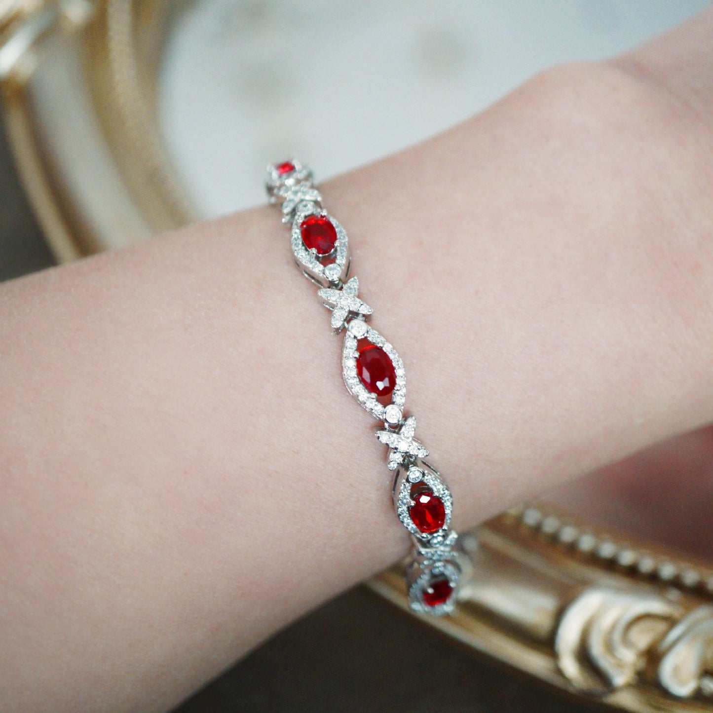 Add a touch of regal elegance to your jewelry collection with our 18K White Gold Plated Zircon Bracelet, available in two captivating colors: royal red and sapphire blue. Each bracelet features dazzling oval-cut zircon gemstones surrounded by intricately set clear zircon accents, creating a timeless and luxurious design inspired by vintage Italian and French styles.