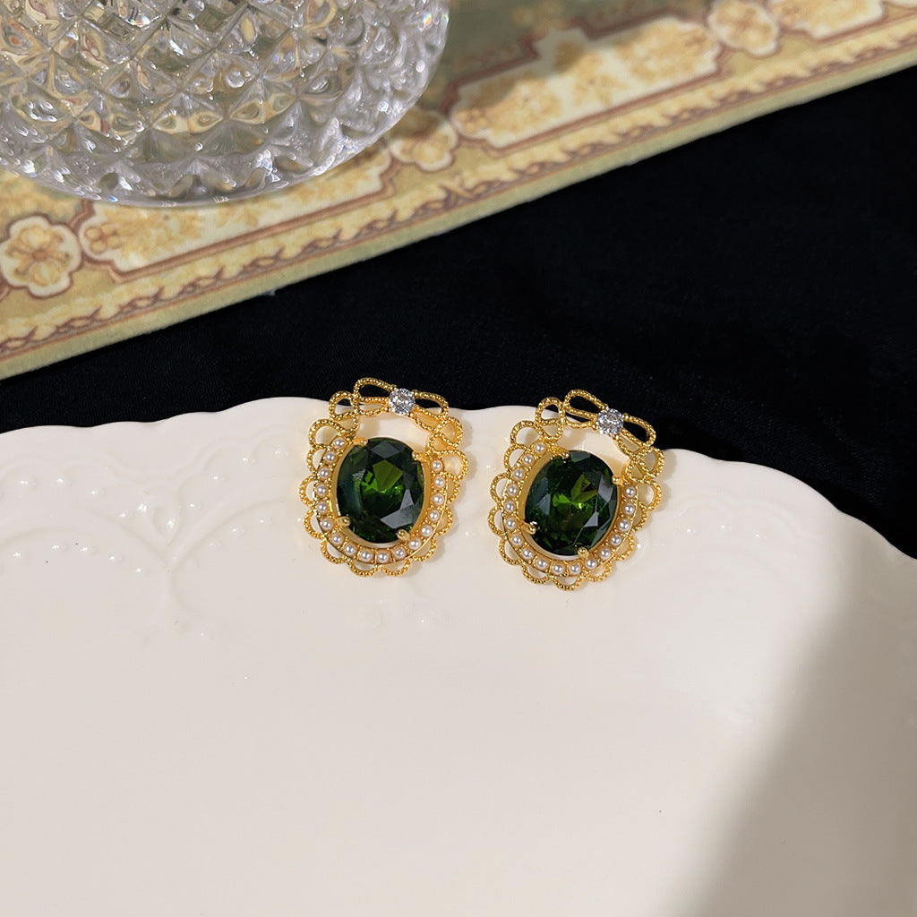 The earrings feature a vintage-inspired design with a modern touch. Each earring boasts a large, oval-shaped olive zircon, which appears to be a peridot or emerald, set in a shimmering gold-plated base. The stone is surrounded by a delicate lace-like pattern adorned with tiny pearls, adding a touch of vintage charm. The overall design is both sophisticated and eye-catching, making these earrings a versatile accessory that can be dressed up or down.