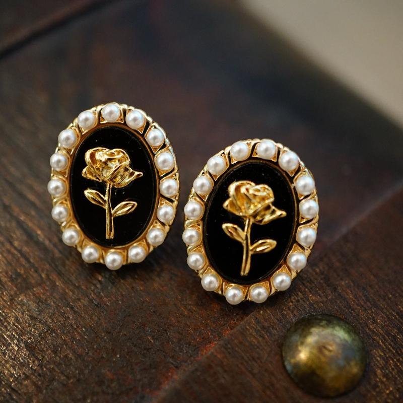 Featuring a delicate gold-toned rosebud design set against a black enamel background, these earrings are both stylish and sophisticated. The surrounding pearls create a shimmering halo that complements the floral motif perfectly. These earrings are perfect for everyday wear or special occasions, and they are sure to make a statement.