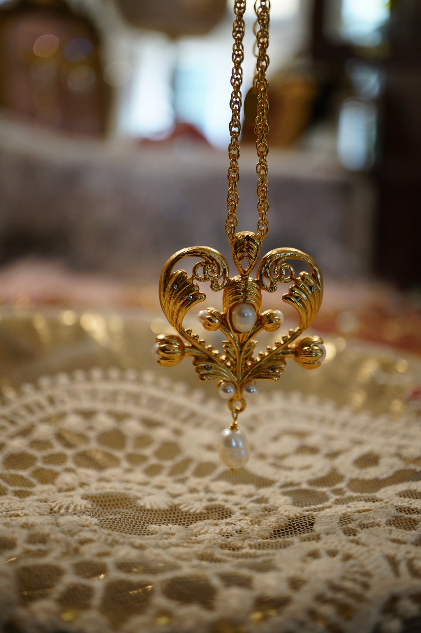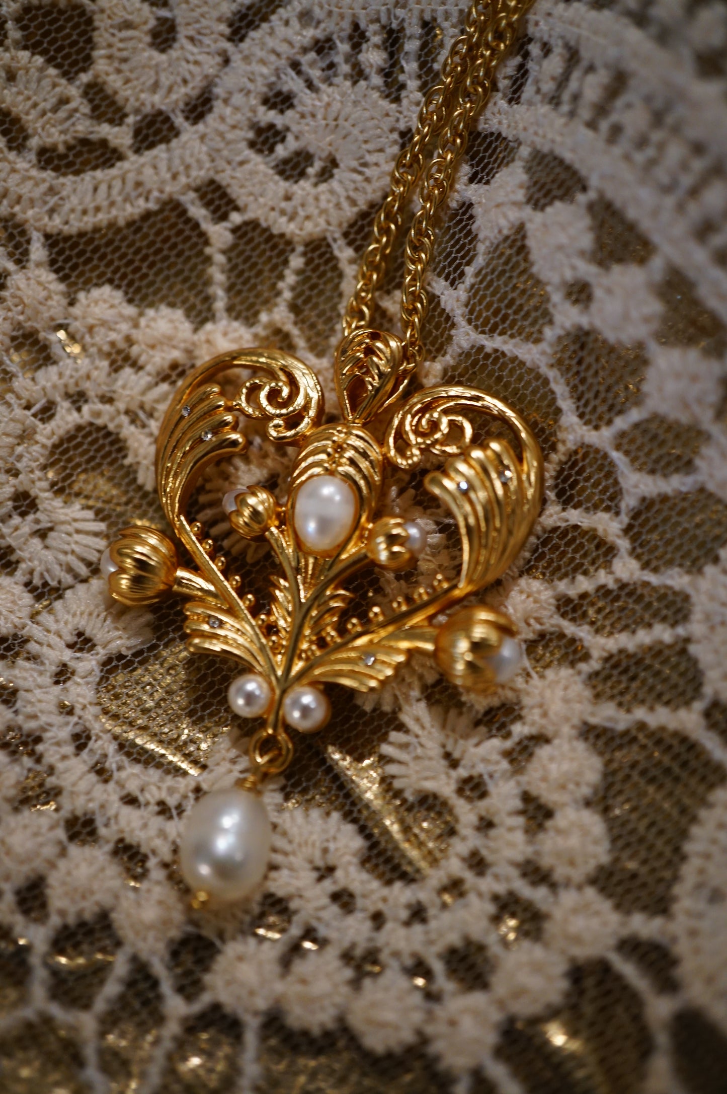 This exquisite vintage gold filigree necklace features a stunning heart-shaped pendant adorned with delicate freshwater pearls. The intricate filigree work creates a captivating and timeless design. The necklace is perfect for adding a touch of elegance to any outfit, whether it's for a special occasion or everyday wear.