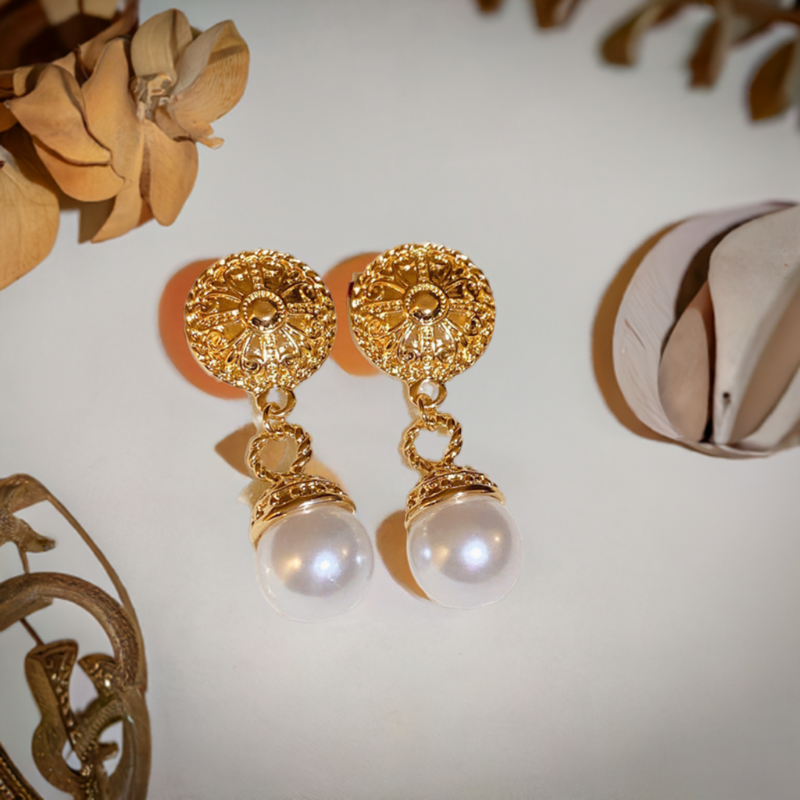 These elegant earrings exude timeless charm. A lustrous, oversized pearl takes center stage, its beauty enhanced by the warm glow of gold plating. Crafted with a nod to classic design, the earrings feature intricate details that evoke a sense of vintage glamour. Whether dressed up or down, these statement pieces add a touch of sophistication to any ensemble.