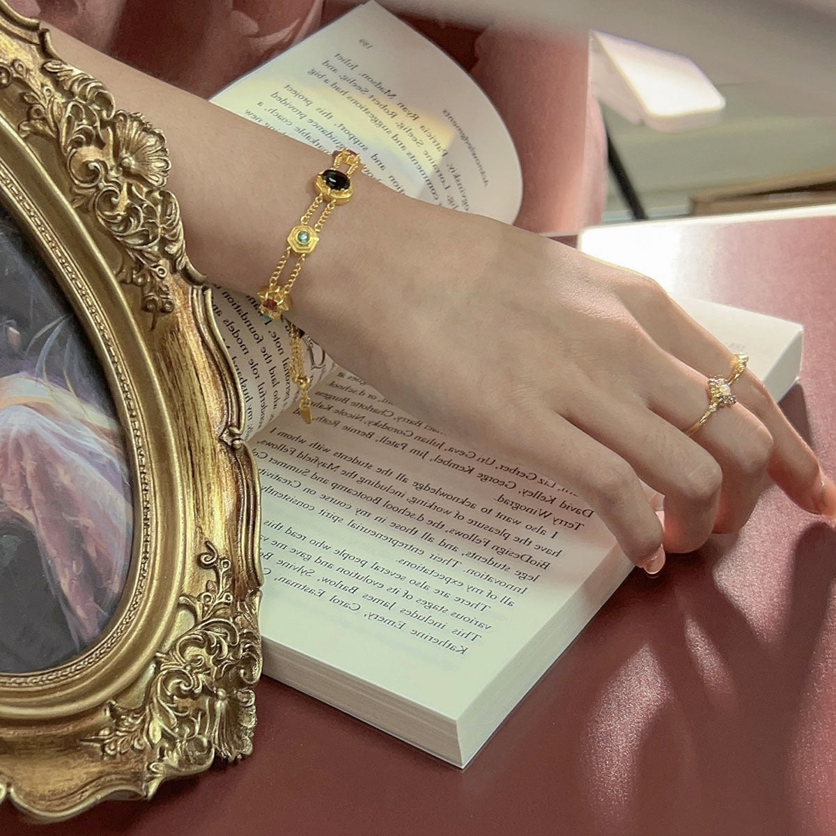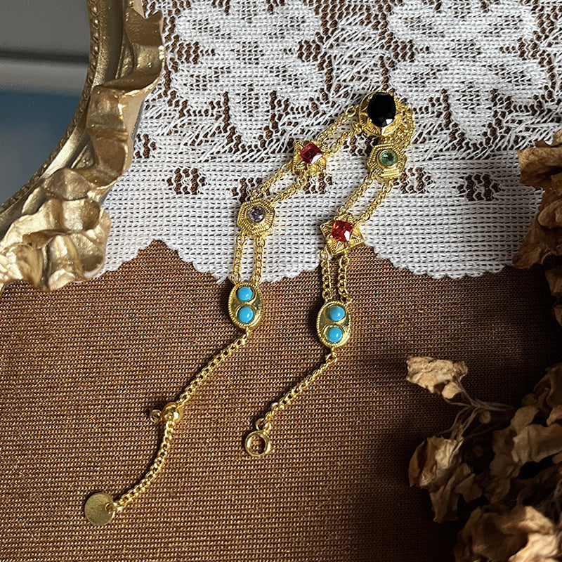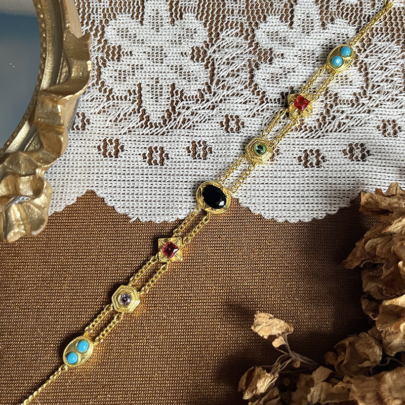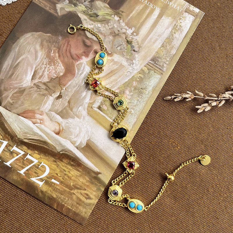 Its gold-plated base shimmers with luxury, while a captivating medley of colorful zircons and rich blue stones creates a mesmerizing interplay of color. Inspired by vintage European design, this bracelet is a testament to timeless elegance.